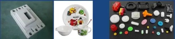 其中熱固性塑料為化學(xué)分子結(jié)構(gòu),一般是一次成型。如上左圖中開(kāi)關(guān)面板和幼兒用的碗都是熱固性塑料加工而成的,它們具有耐高溫的特性,質(zhì)地堅(jiān)硬、難以熔化,加熱后也不再軟化,過(guò)度加熱直接分解。